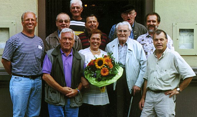 Abschied mit einem Blumenstrauß von der lieben " Bräustübel - Wirtin "